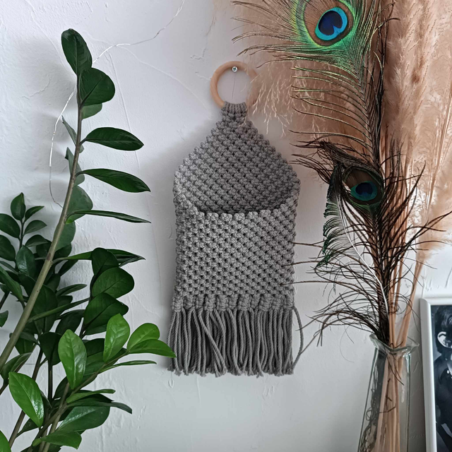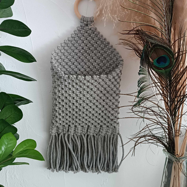 Cette pochette murale en macramé apporte une touche d’originalité à votre intérieur tout en restant pratique. Parfaite pour organiser clés, câbles, chargeurs ou petits accessoires, elle allie esthétique bohème et fonctionnalité au quotidien.